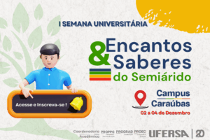 De 1 a 6 de dezembro, a UFERSA Campus Caraúbas realizará a I Semana Universitária com o tema “Encantos e Saberes do Semiárido”. O evento é uma programação das pró-reitorias ligadas ao Ensino, Pesquisa e Extensão (PROEC, PROGRAD e PROPPG) e a Coordenadoria Acadêmica (COAC) dos Campi da UFERSA.