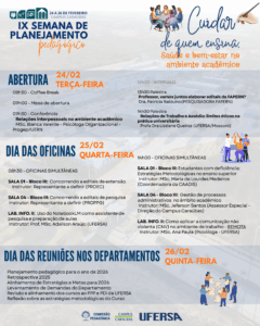 O Centro Multidisciplinar de Caraúbas (CMC) realizará, entre os dias 24 e 26 de Fevereiro, a IX Semana de Planejamento Pedagógico, com o tema “Cuidar de quem ensina: saúde e bem-estar no ambiente acadêmico”. O evento, que contará com atividades presenciais e virtuais, tem como objetivo refletir sobre as relações interpessoais no ambiente acadêmico, o uso de ferramentas de inteligência artificial, e os editais de pesquisa e extensão na universidade, além de promover a integração entre docentes, técnicos e gestores.