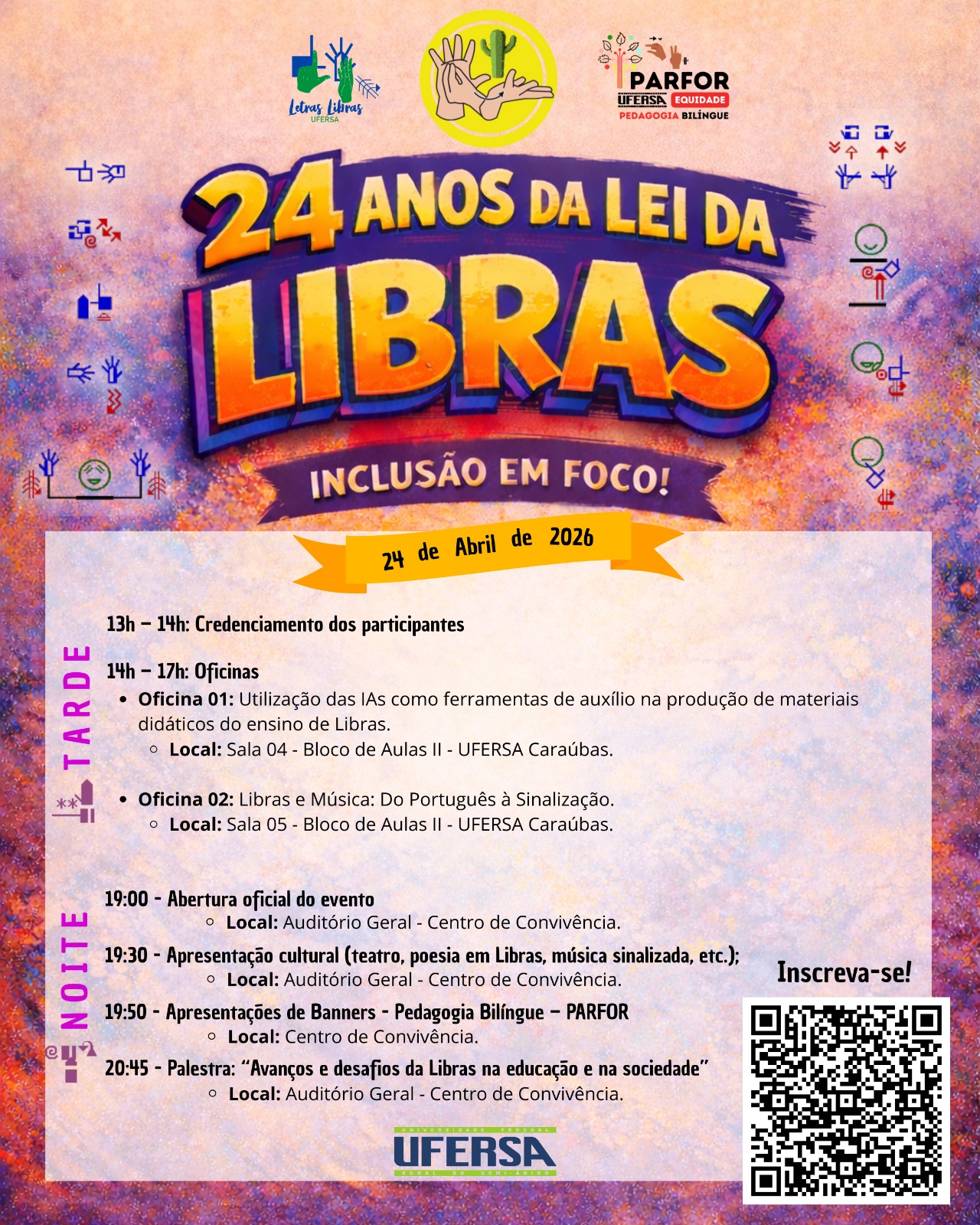O Campus Caraúbas da Universidade Federal Rural do Semi-Árido (UFERSA) realizará, no dia 24 de abril de 2026, o evento “Libras em foco: 24 anos de reconhecimento e desafios na sociedade brasileira”, em alusão às mais de duas décadas de oficialização da Língua Brasileira de Sinais (Libras) no país.
