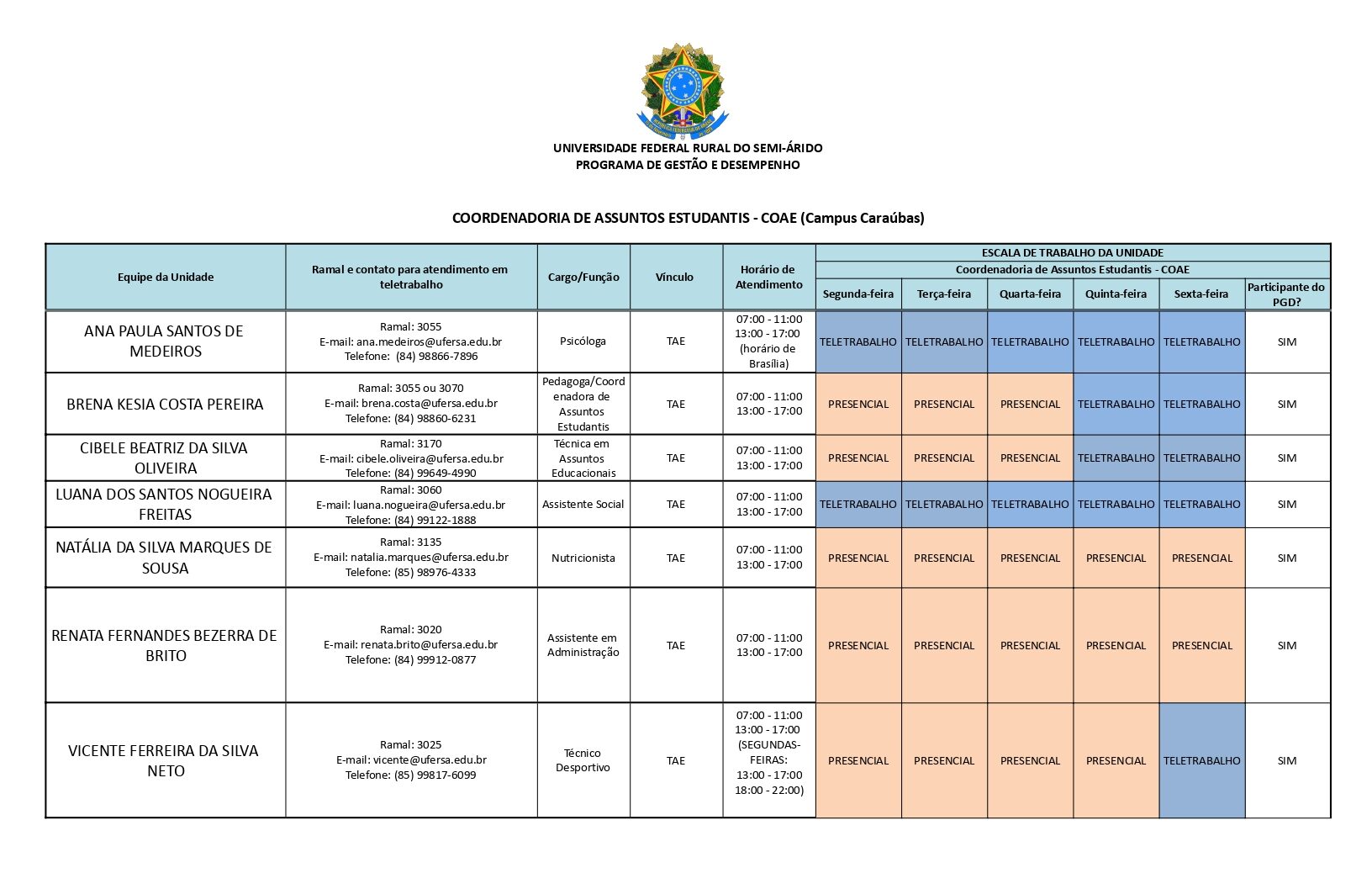 Confira abaixo a escala de trabalho dos servidores da Coordenadoria de Assuntos Estudantis do Campus Caraúbas – UFERSA para o período de 01/05/2025 a 31/12/2025.
