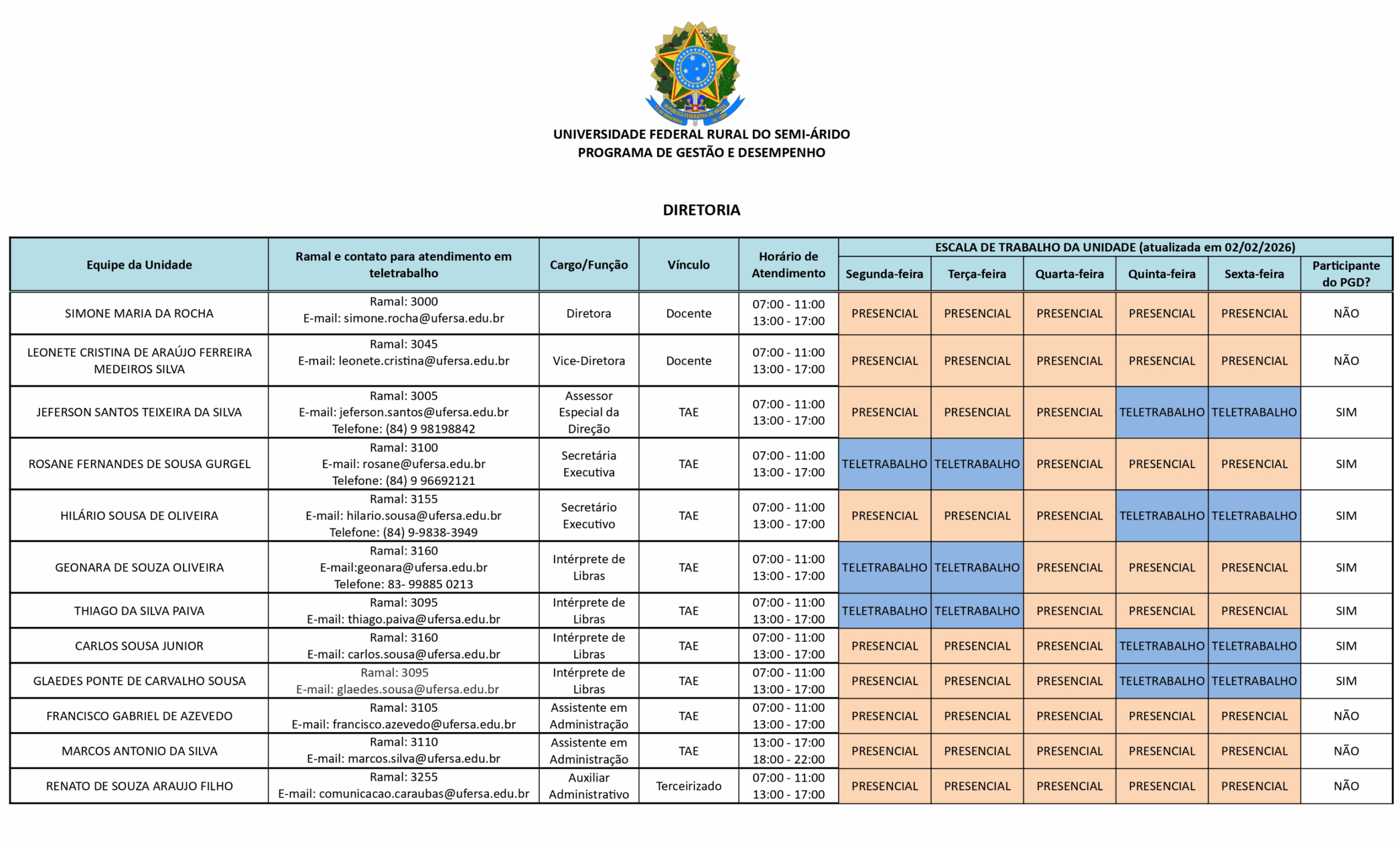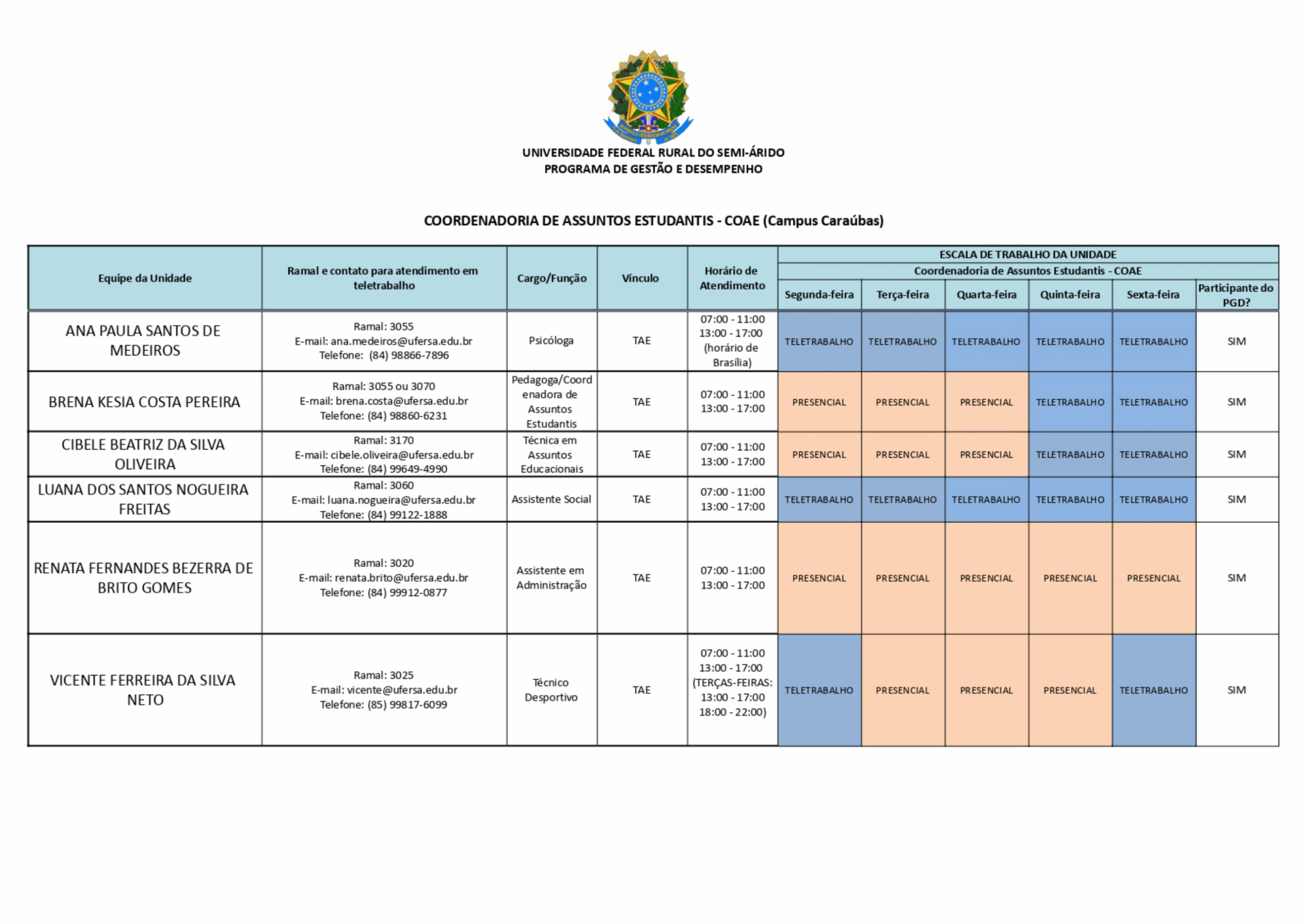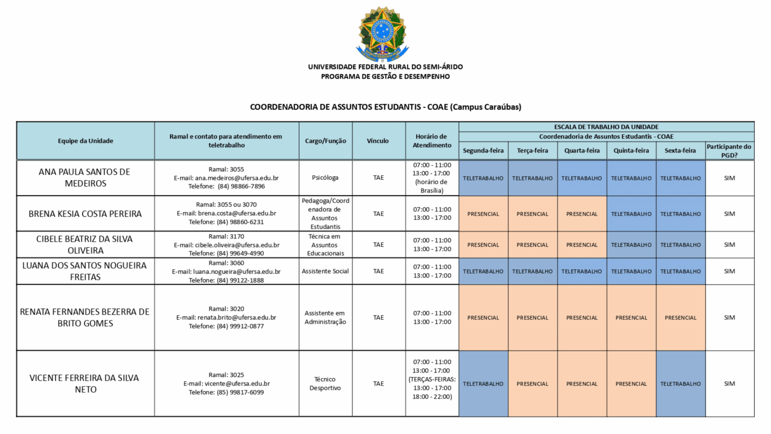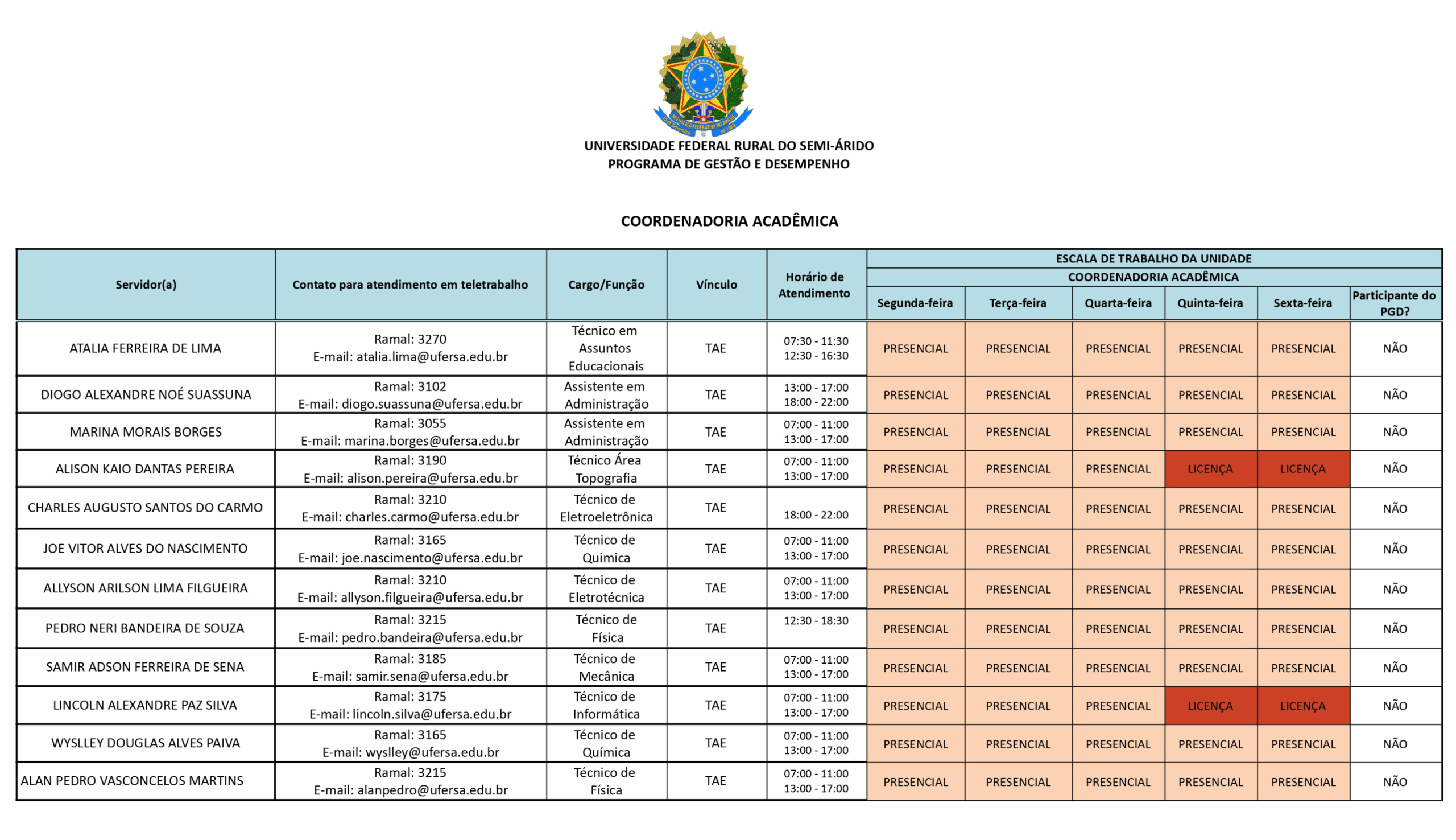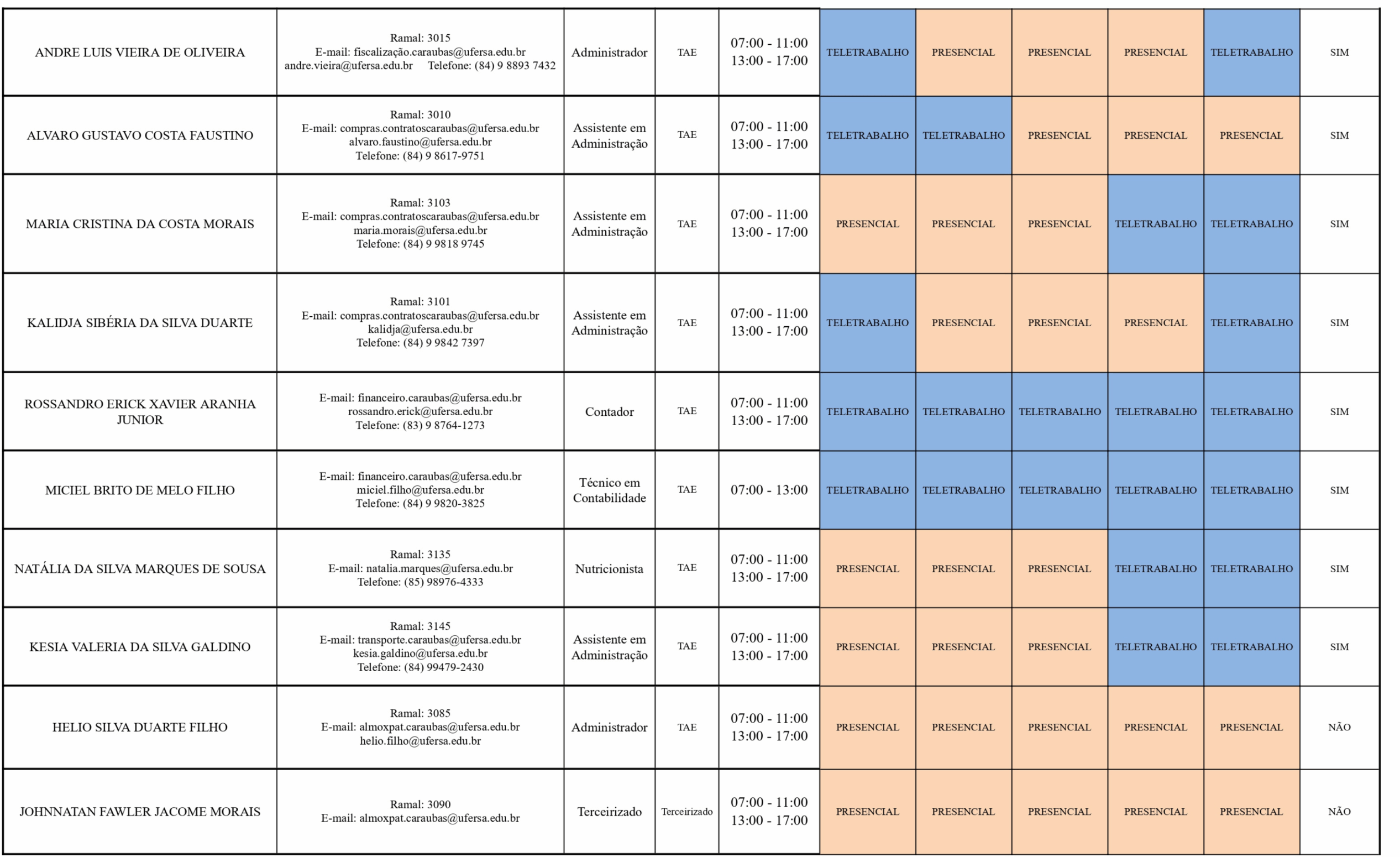 Confira abaixo a escala de trabalho dos servidores do Campus Caraúbas – UFERSA para o período correspondente a 1º/05/2025 a 31/12/2025.